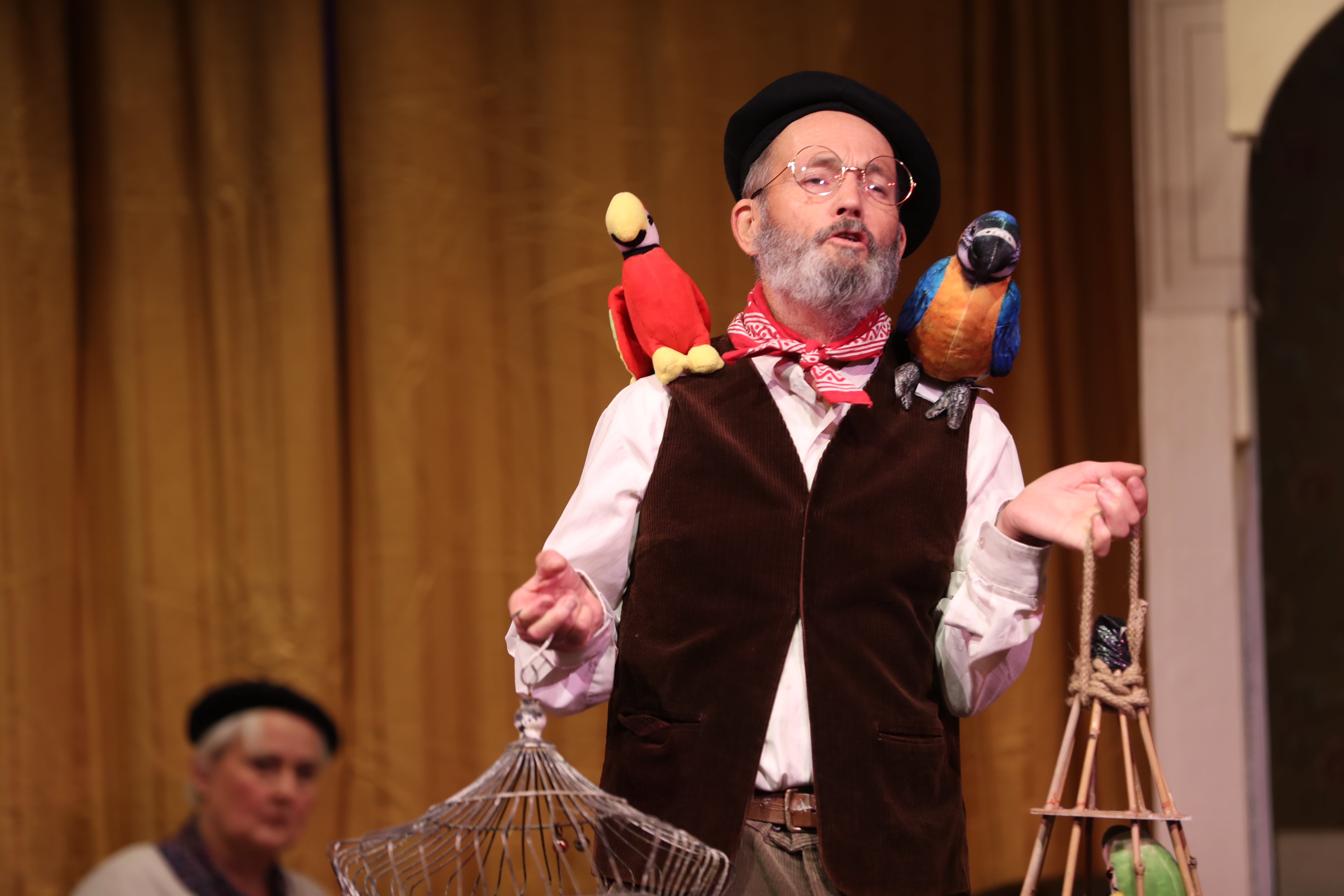 The set was super. The café bar looked very authentic, with shelves behind holding glasses, a tureen, flowers and of course bottles. The blue and white checked tablecloths were very pretty. There were stairs in the centre of the set which led upstairs to the bedrooms, so we had scenes with Edith’s mother and with Edith and Rene in bed, once a curtain had been pulled across to reveal them. Set changes were slick. Rene’s cellar contained hanging hams, and crates. Herr Flick’s Gestapo HQ had a painting of Hitler and some swastika medallions on the wall. Colonel von Strohm’s office was quite comfortable. There were many hilarious props, including M. Leclerc’s parrot-salesman’s contraption which delivered the cockatoo radio in an elaborate cage. There were the 2 Knockwursts, the painting of the Fallen Madonna with the Big Boobies, Mama’s huge ear trumpet, a blow-up Hitler and many more besides.