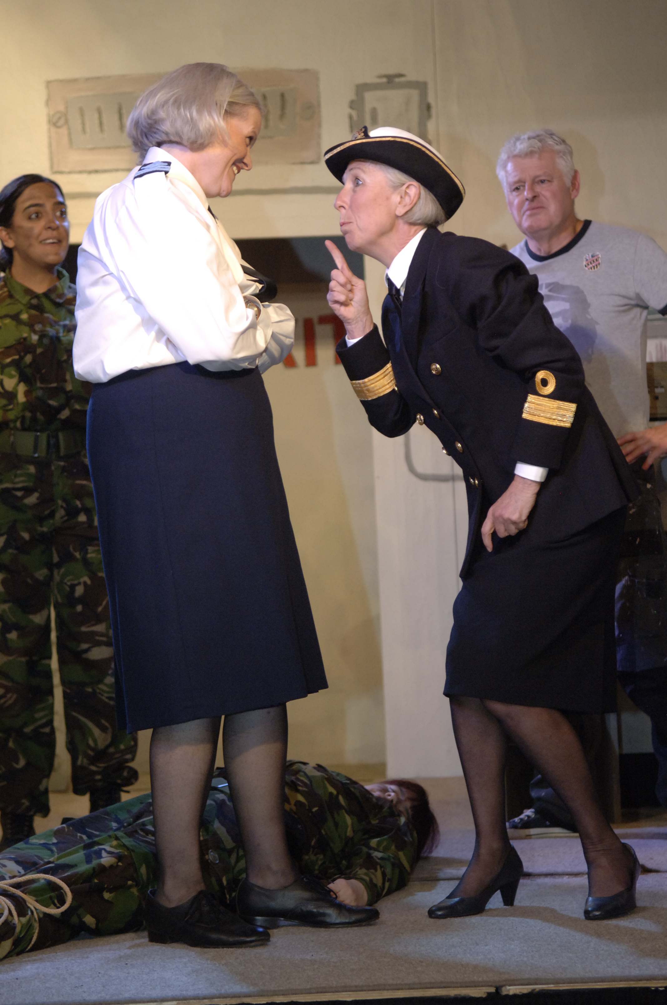 Finally the navy was alerted to unexpected developments at the, as they thought, abandoned facility. Luckily a group of recruits was training nearby, so their commander Connor was sent in with a young recruit, Taylor, in full combat gear, brandishing their scary looking machine guns, to investigate. Chaos ensued. Connor (Amy Aiello) was of a nervous disposition, was claustrophobic, and thus had a panic attack. To calm her down, Joan gave her a tablet (a cat-worming one, the only one she had in her handbag at the time!) Connor promptly collapsed, and young Taylor (Nikki Harish) proved to be far more resourceful than her boss. The action continued at a fast pace, the humour was slick and very well brought out. Peter was still in his frock on the chair and so on. The place went into lockdown, a carrier pigeon was sent to the rescue and fetched the fourth member of the team, Bill (Steven Webb).
