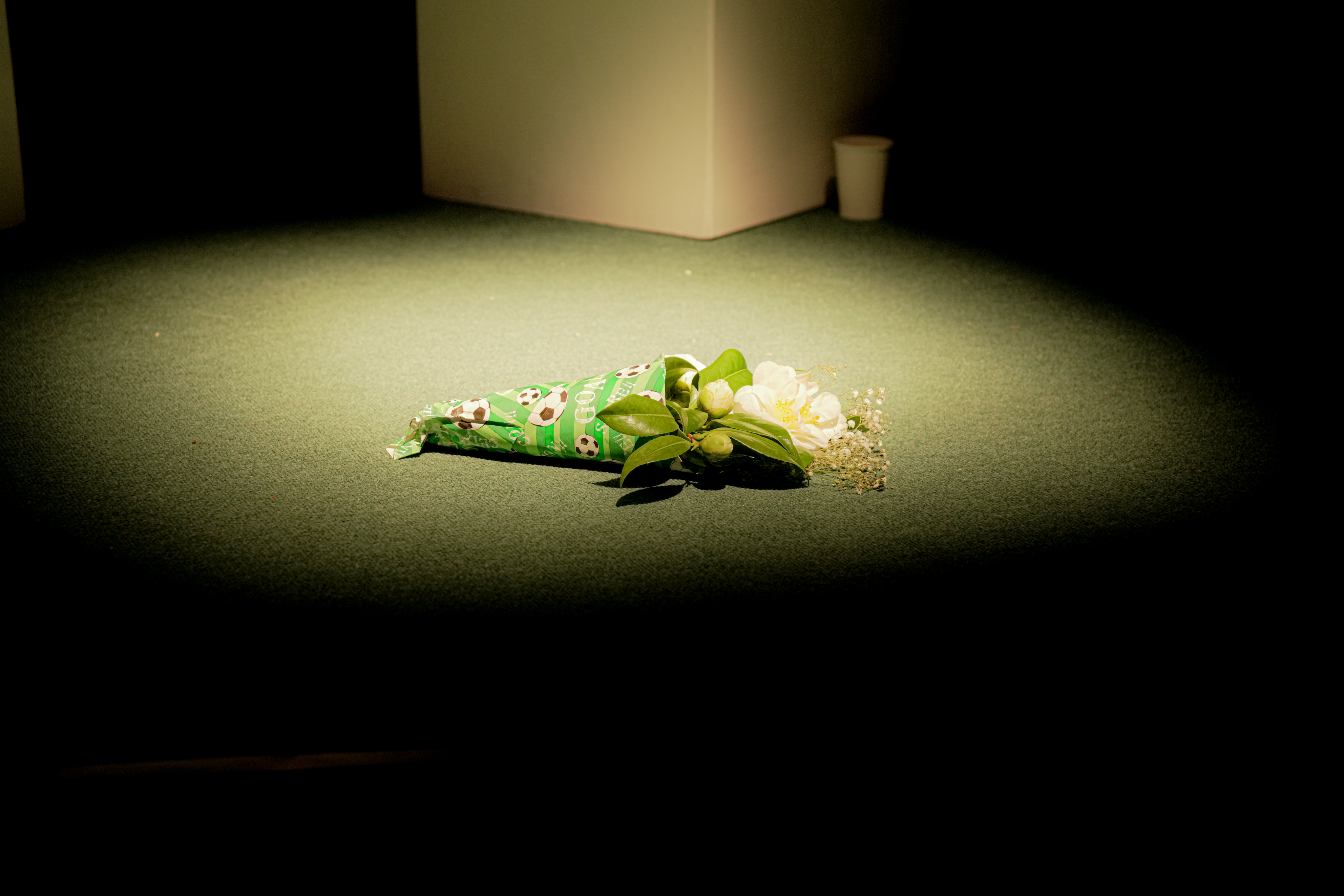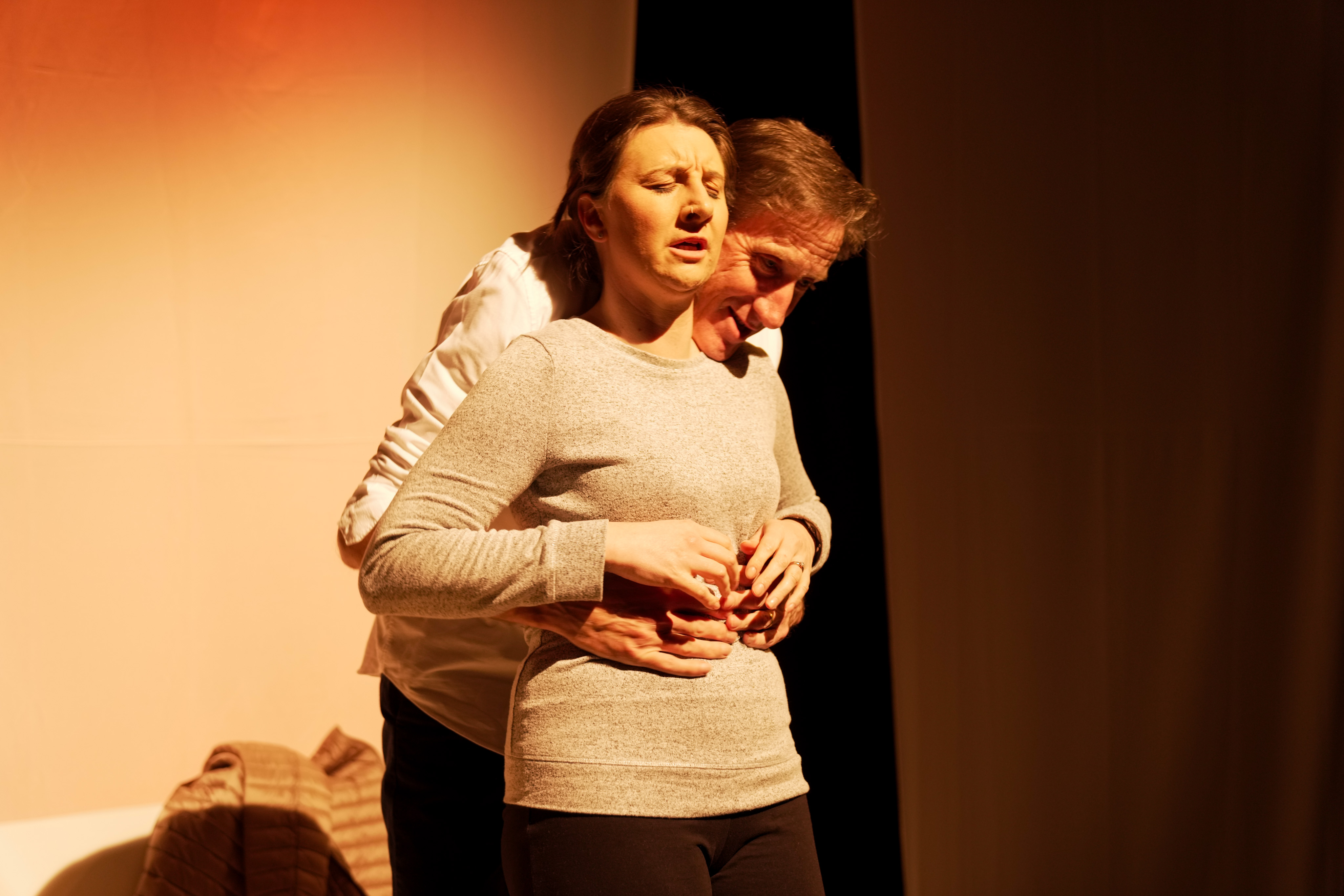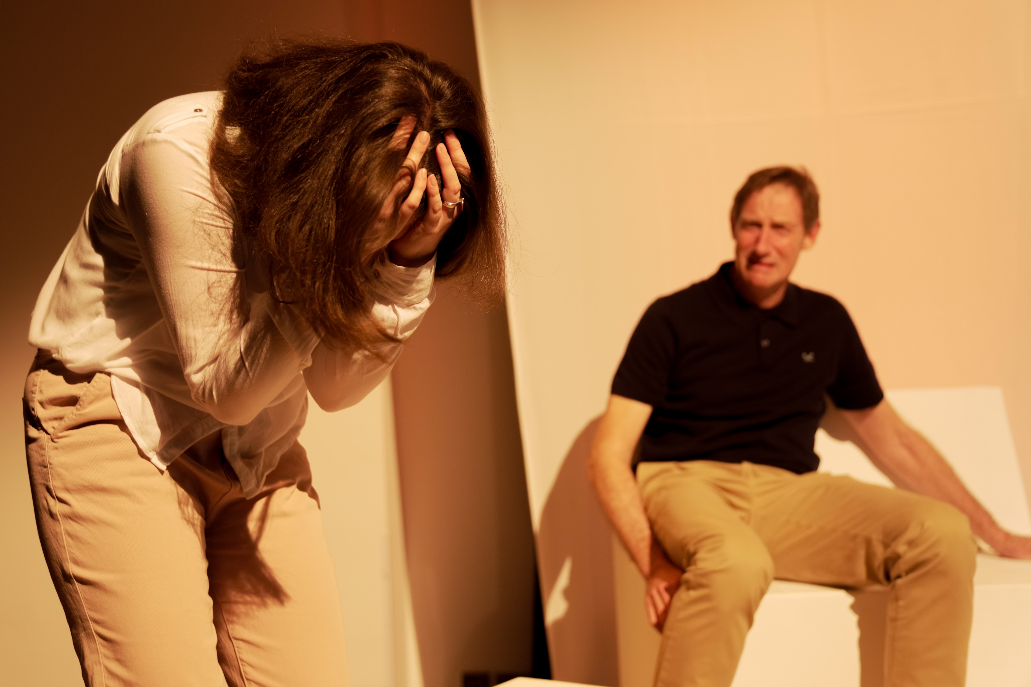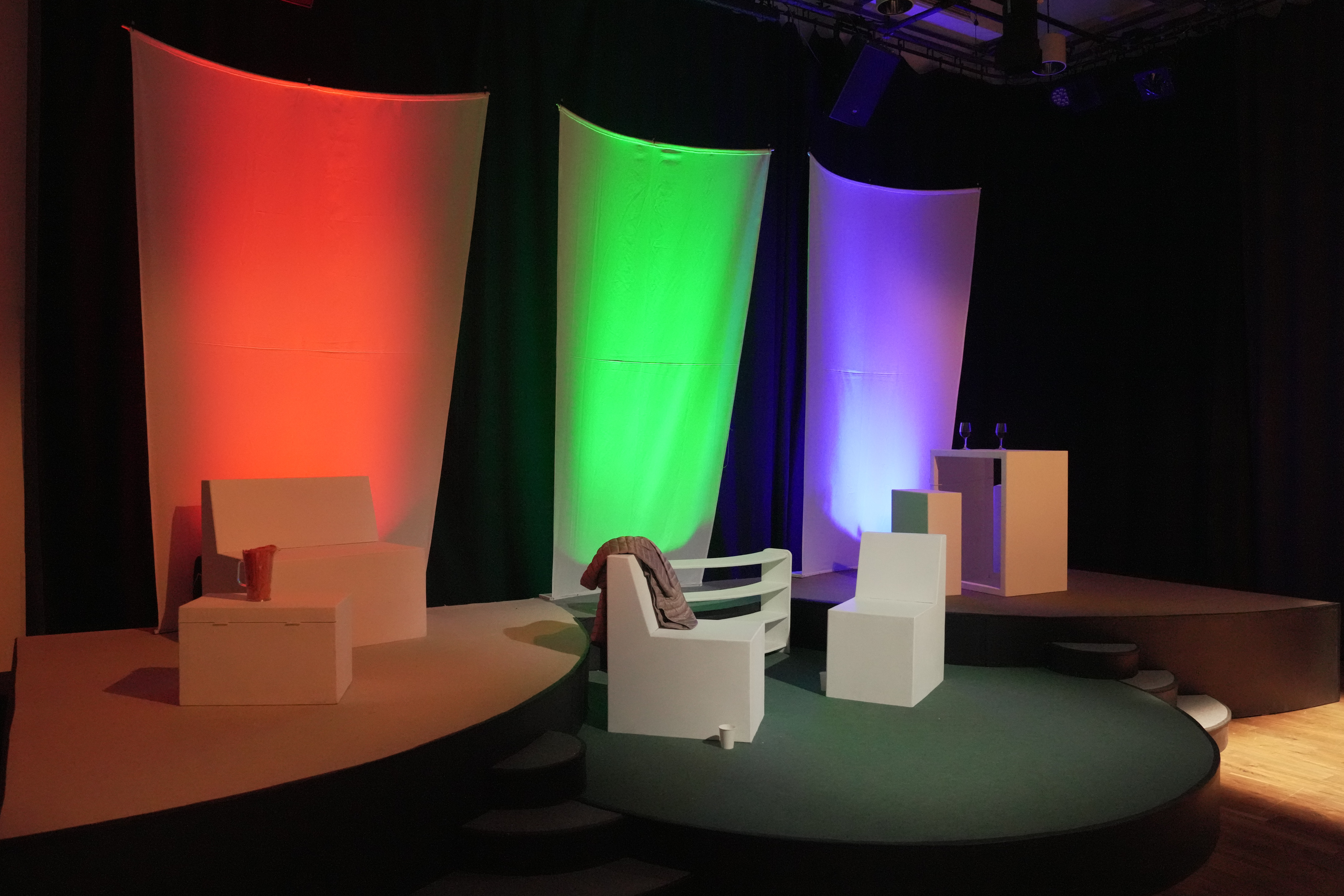The striking set, designed by David Hemsley-Brown, was stark. All-white plastic furniture, set on three different levels. On the left was Hannah’s living room, just a coffee table and a bench, representing a sofa. In the middle, on the lowest level, was an empty bookshelf in front of which were two chairs, this was the realm of the therapy sessions. On the right was a bar with two bar stools, where Hannah would sometimes meet with a friend. The only pieces of colour were an orange vase on the coffee table, and two glasses of red wine on the bar. As a backdrop were three white sheets, onto which lighting of different colours was projected. Another fine set from Guildburys – one of their many talents.