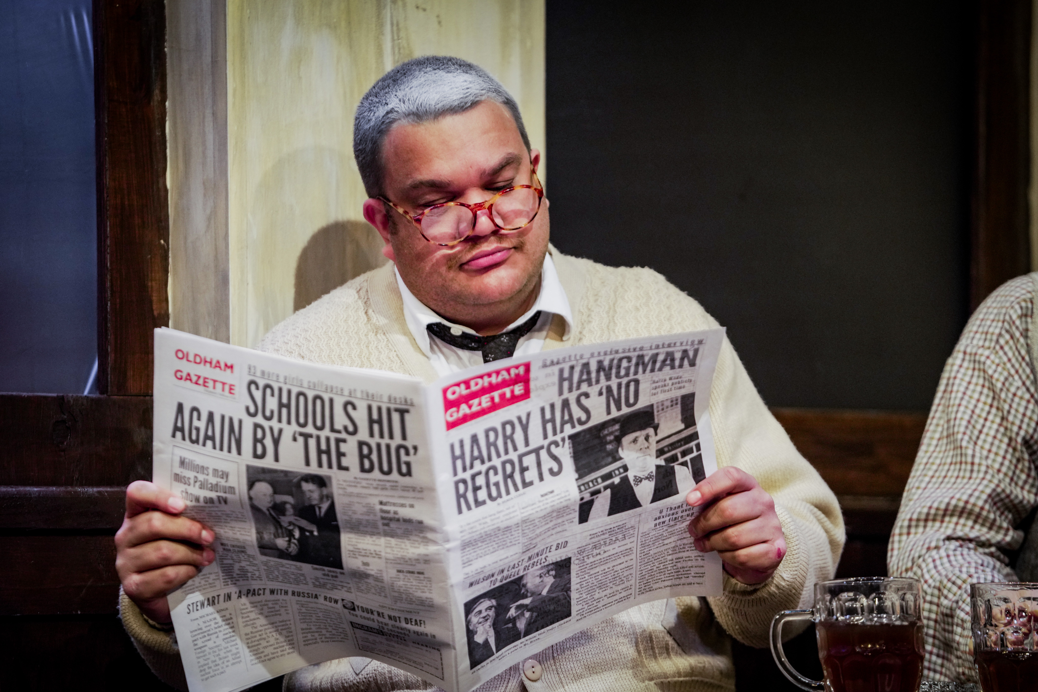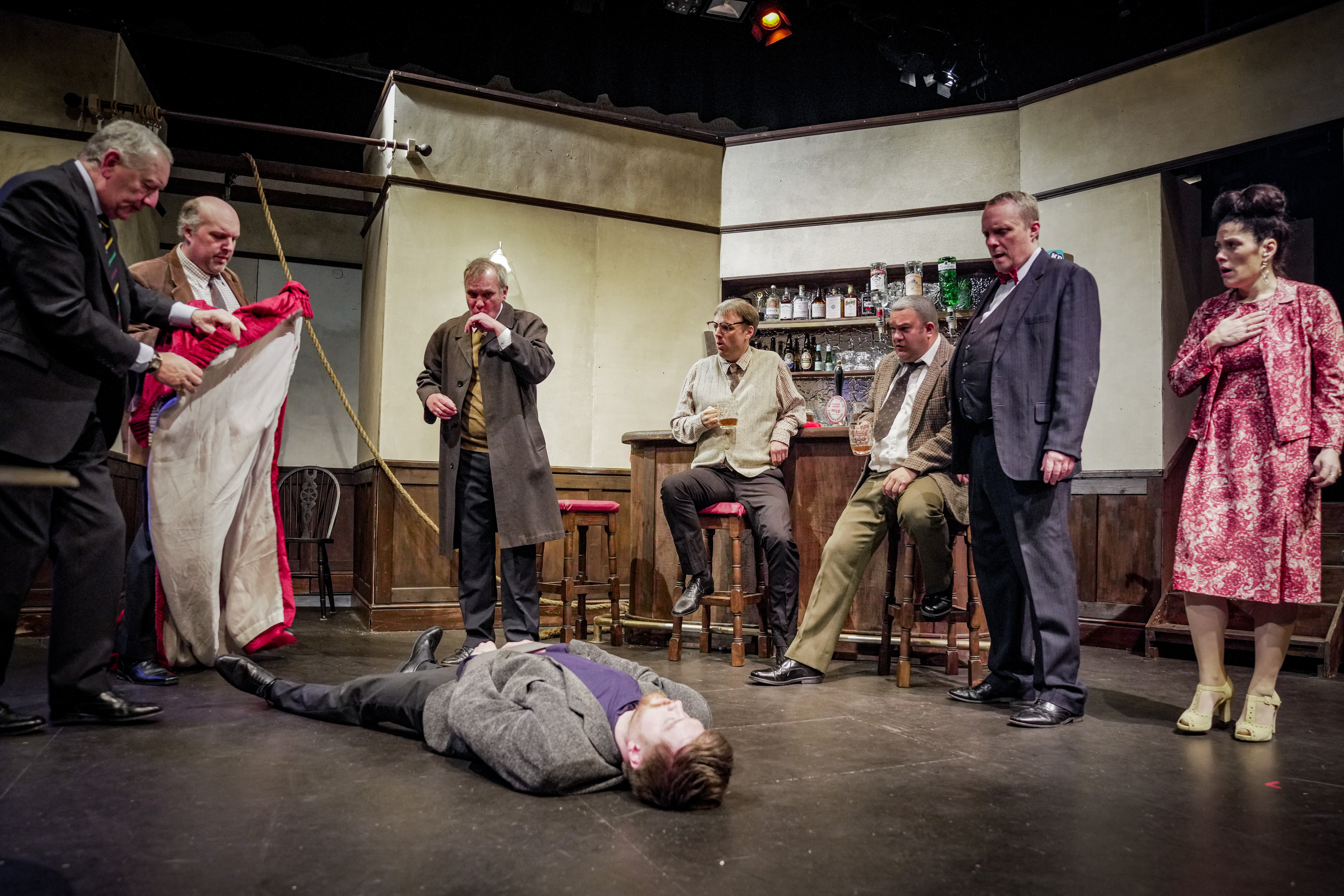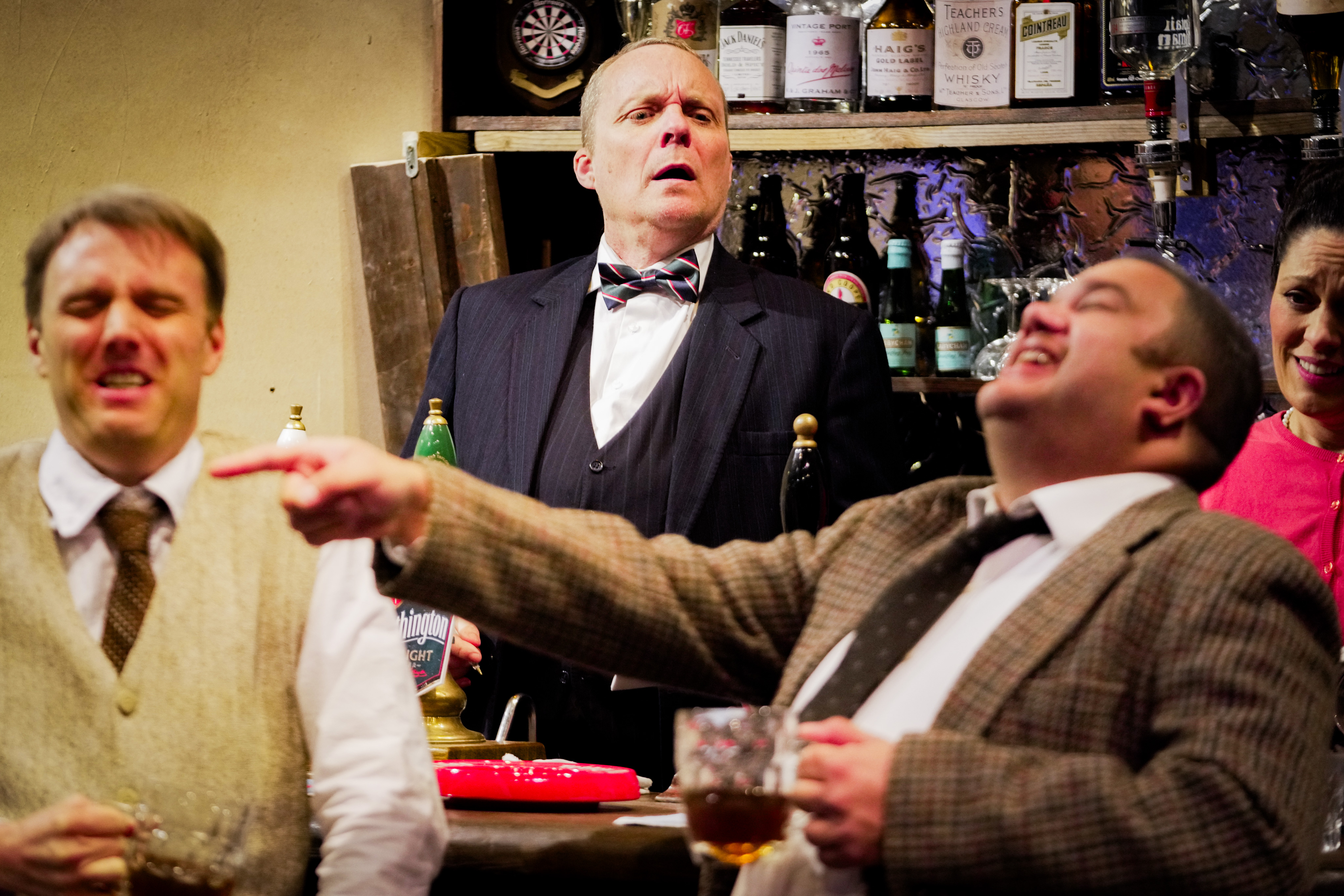 A young enthusiastic journalist Clegg (Joe Hall) tries to engage Harry in conversation about his views on the abolition of hanging. ‘No comment’ from Harry for quite a while, but then his ego cannot resist, and the threat by Clegg to go to rival Pierrepoint instead nails it, and he invites Clegg upstairs for an interview. An ominous atmosphere is building up. The very strong cast enjoy building up the rich characters, the humour bubbles away: ‘The guillotine’s messy, - and French.’ The trio of regulars are great, Jez Gooding as Charlie, always repeating what’s been said into the ear of bumbling, hard of hearing Arthur, played by Oli Bruce, and Matthew Lacey as the old soak Bill, always up for a free pint if able to scrounge one. Jonathan Arundel was the slightly worrying tight-lipped Inspector Fry, was he on duty? He certainly quaffed a few pints.