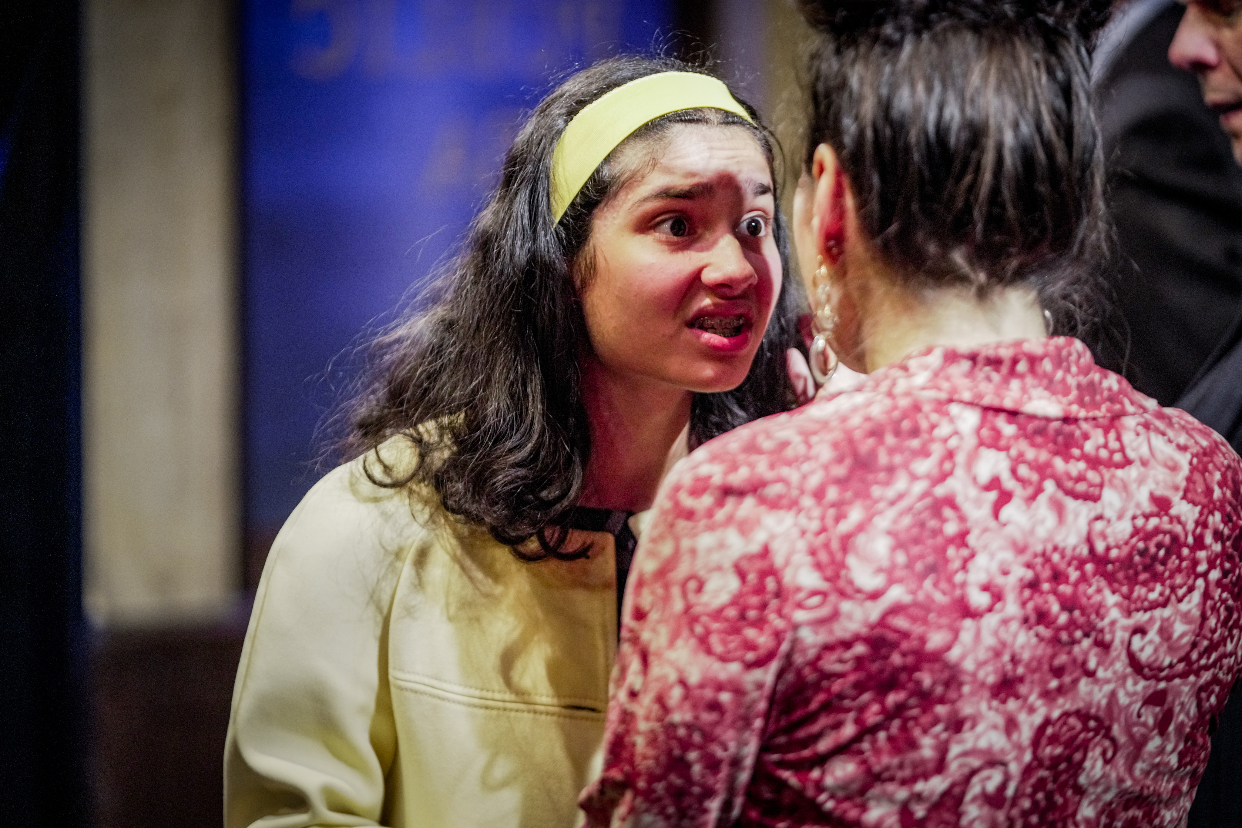 A projection flashed the passing few years onto a backdrop. Now in 1965 the curtain opened onto Harry Wade’s pub. Harry, 3-piece suited and wearing his trademark bow tie, was serving along with his wife Alice. Harry was a proud confident man, his wife (played by Mary Ormond) a competent, friendly landlady, though she seemed a bit downtrodden. The regulars, Bill, Charlie and Arthur engaged in chatter with Harry, the subject of Hennessy’s possible innocence came up. A sardonic police inspector stood apart at the bar, occasionally joining in the conversation, but separate. Shirley, the Wade’s 14-year-old daughter was helping out at the bar. She was shy, awkward, anxious and almost bullied by her father, who called her mopey. A good performance by Anna Joshi.
