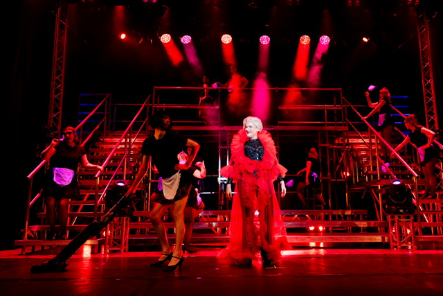 Costumes were fun. The Bohemians and Scaramouche wore a motley collection of clothes they seemed to vaguely suppose rock fans must have worn back in the days of the music. The Teen Queens wore a kind of uniform of white miniskirts or shorts with pastel highlights. There were some scary guards or thought police, all in black, wearing helmets and goggles. In one scene the Rock Royalty team wore fabulous grey jumpsuits with a red belt and red sunglasses. The Killer Queen’s main colour seemed to be dangerous red, a red trouser suit, or a red and black outfit with startling red shoes and skirt, black corset over, and slinky black leather skirt. Khashoggi was clad in a long intimidating black leather coat, with shiny suit beneath, and always shades!
